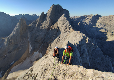 Un objetivo ambicioso, la cumbre más alta de Asturias, mejor dicho de Los Tres Macizos de los Picos de Europa, Torre Cerredo 2.648m alcanzada por una aristas muy aérea y salvaje no apta para cardiacos, con dificultades no superiores al IV grado.